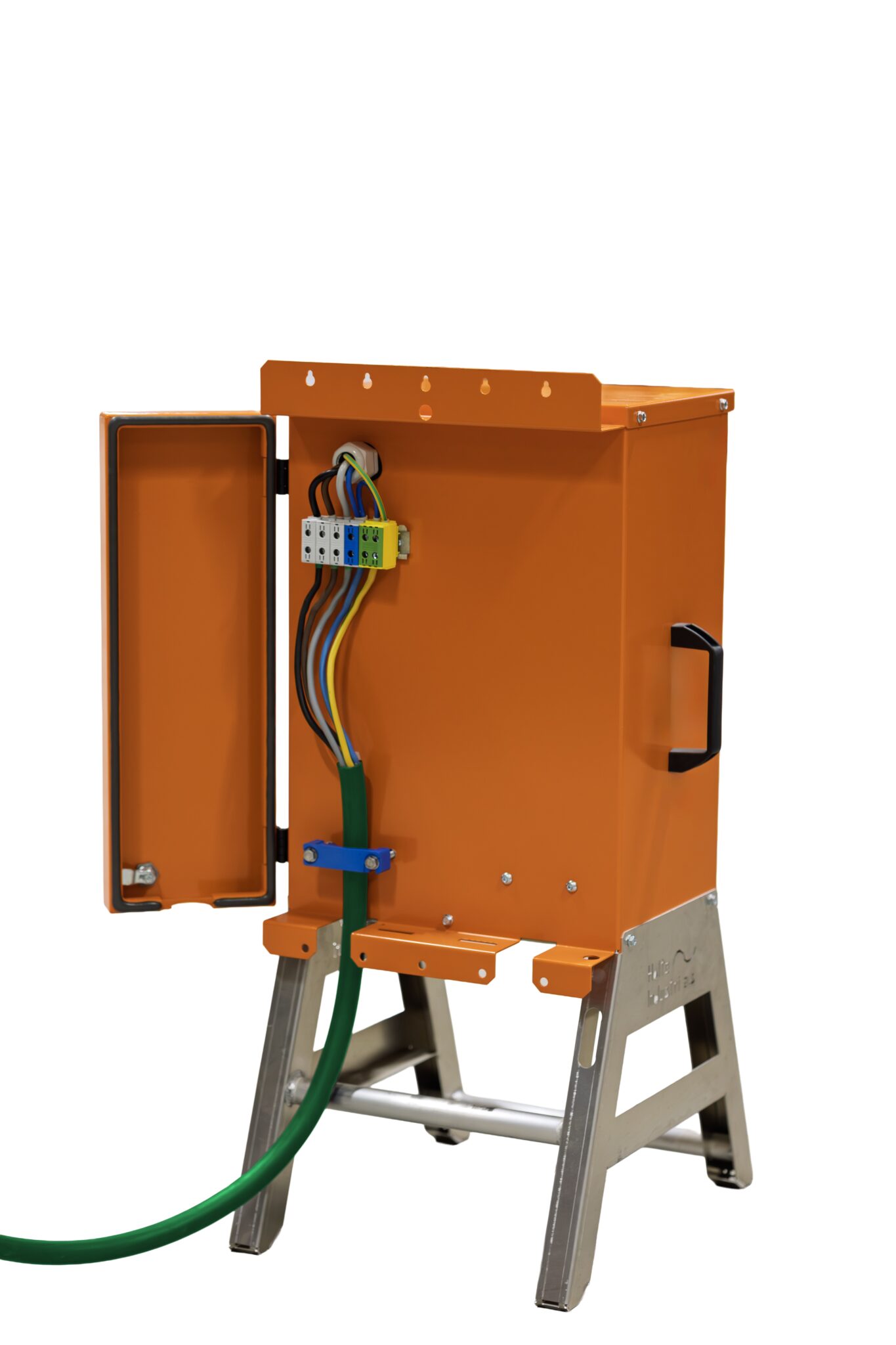 HS 63 m:ryggskap 400v HS 63A byggestrømsentral med integrert ryggskap er den ideelle løsningen for byggeplasser som krever sikker og funksjonell kabeltilkobling. Skapet er utviklet for TFXP-kabler opptil 50mm², og fjerner behovet for eksterne skjøter på bakken, som ofte kan føre til fuktinntrengning og økt berøringsfare. Denne funksjonen sikrer en tryggere og mer pålitelig strømtilkobling for alle typer byggeprosjekter.