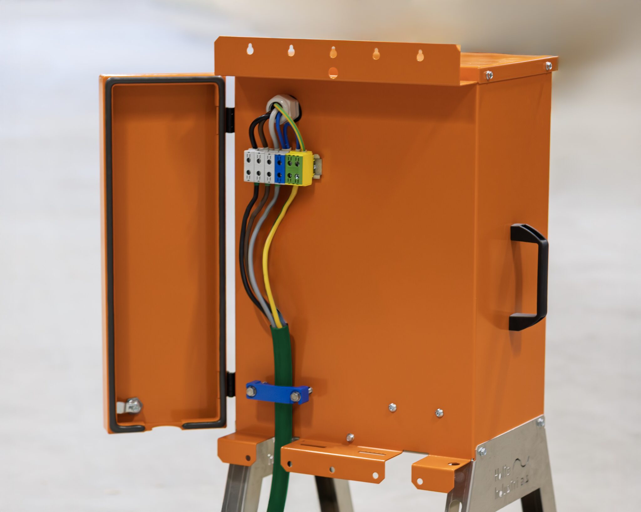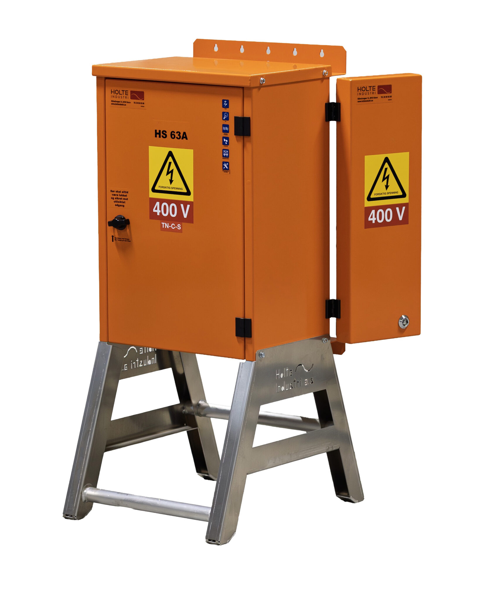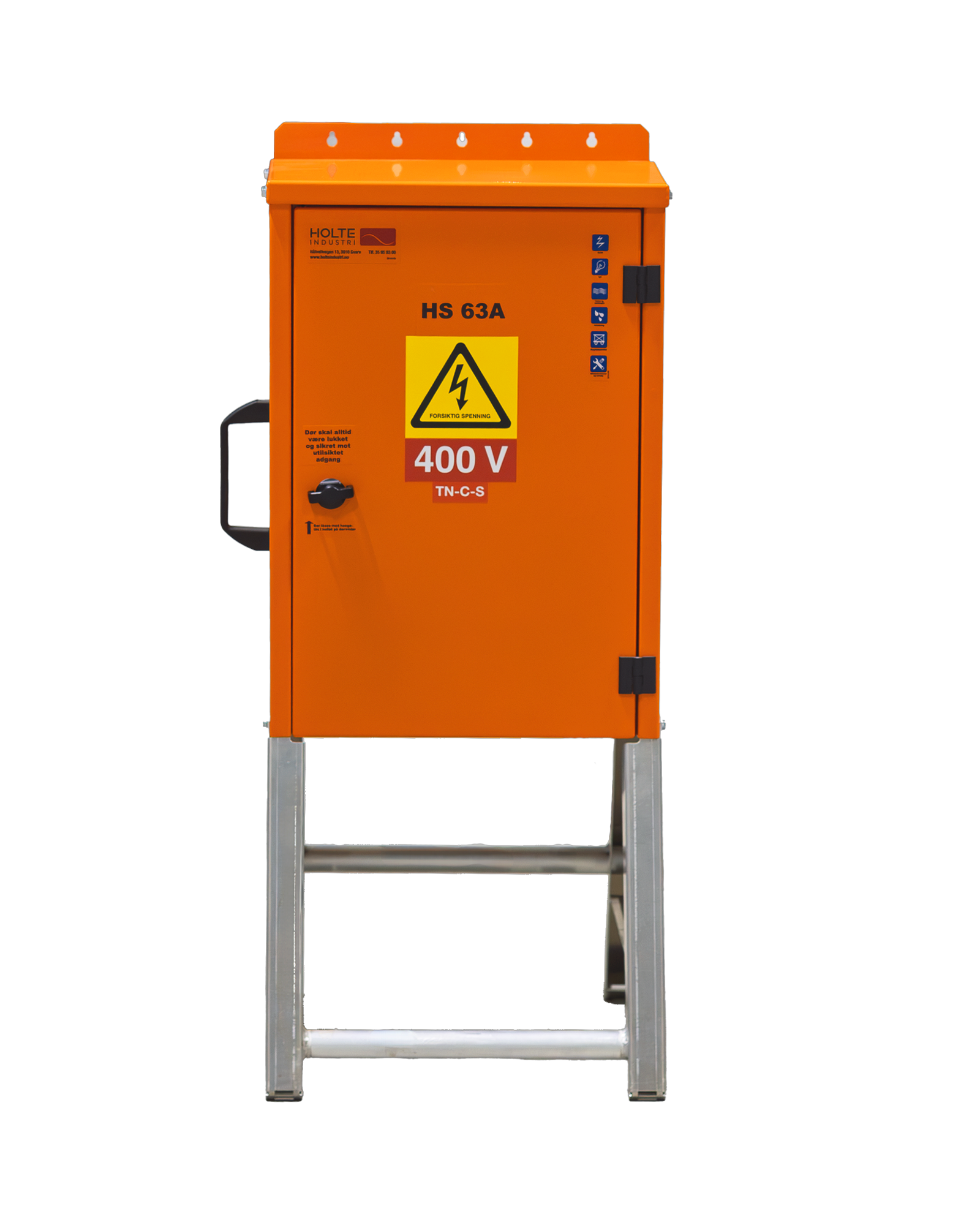 HS 63A er bygd i henhold til NEK 439-standardene for flyttbare byggeplassentraler og leveres med overspenningsvern som standard. Alternativt kan den også leveres som HS 32A med en 32A inntakssikring.