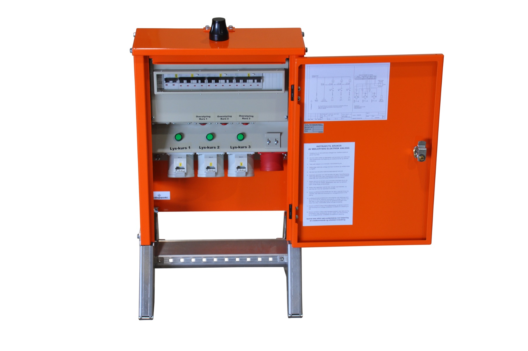 For enkel lokal styring er lysstyringssentralen utstyrt med manuelle brytere på hver kurs. Hver kurs har også sin egen kontaktor og jordfeilautomat for å sikre trygg og pålitelig drift. Skjøtekabler fra sentralen kobles til forgrenere der lampene enkelt kan tilkobles, noe som gjør installasjonen rask og effektiv.