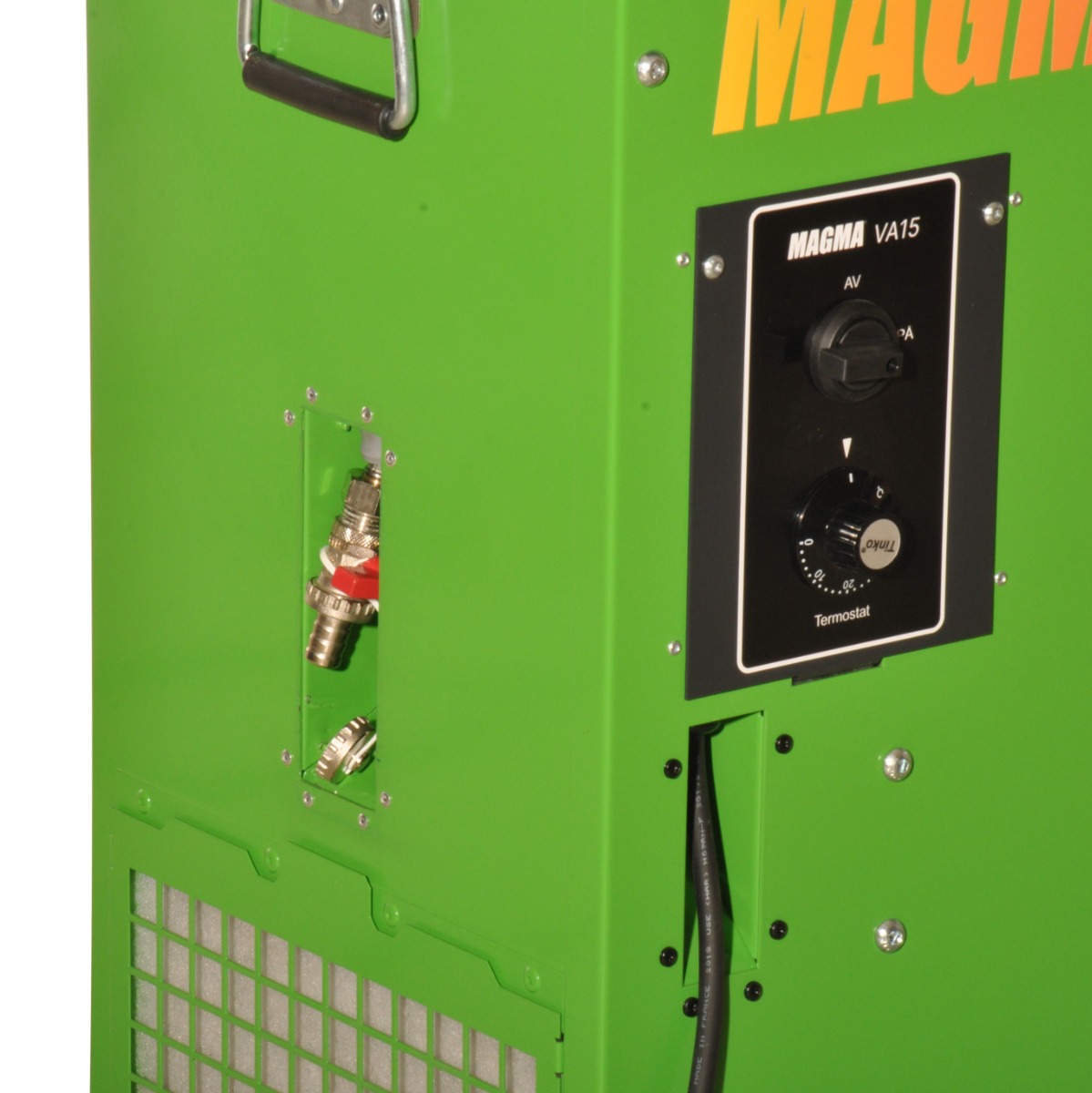 Magma VA15 er et robust og pålitelig varmluftsaggregat designet for profesjonell bruk i industri, bygg og anlegg. Denne byggvarmeren er laget for å gi effektiv punktoppvarming i større lokaler. Magma VA15 er spesielt egnet for oppvarming av områder som garasjer, verksteder og frosttruede arealer, og kan brukes både til å tilføre varme og til å temperere rom.